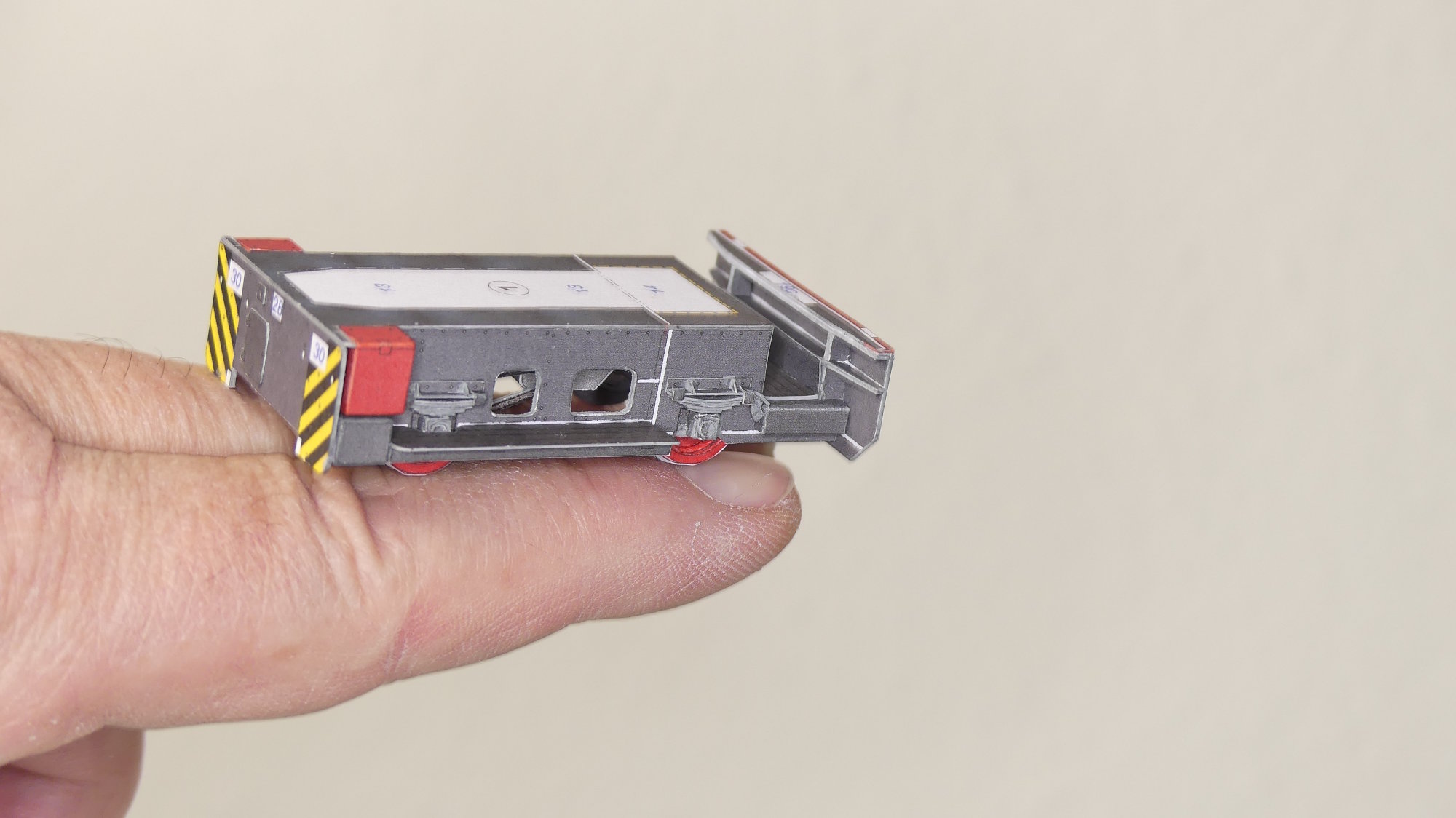 Ich bin mit dem 275-Teile-Modell fertig bzw. das Modell mit mir und auch etwas Inneneinrichtung ist im Bogen geblieben. Ich kann gar nicht beschreiben wie klasse ich das Modell finde und hoffe, ich habe einen Weg zu einem „gut machbarem“ Modell gefunden, statt zu einem wegen der vielen Kleinstteile kaum noch bastelbaren Modell. Weil ich genau diese Klein- und Kleinstteile nicht mehr wollte, habe ich diejenigen Bauteile, bei denen sich das Papier beim Aussticheln mit dem Skalpell spaltete, „vorsichtshalber“ weggelassen. Eine Handvoll Bauteile sind aber trotzdem sehr dünn oder klein und durften einfach nicht fehlen.