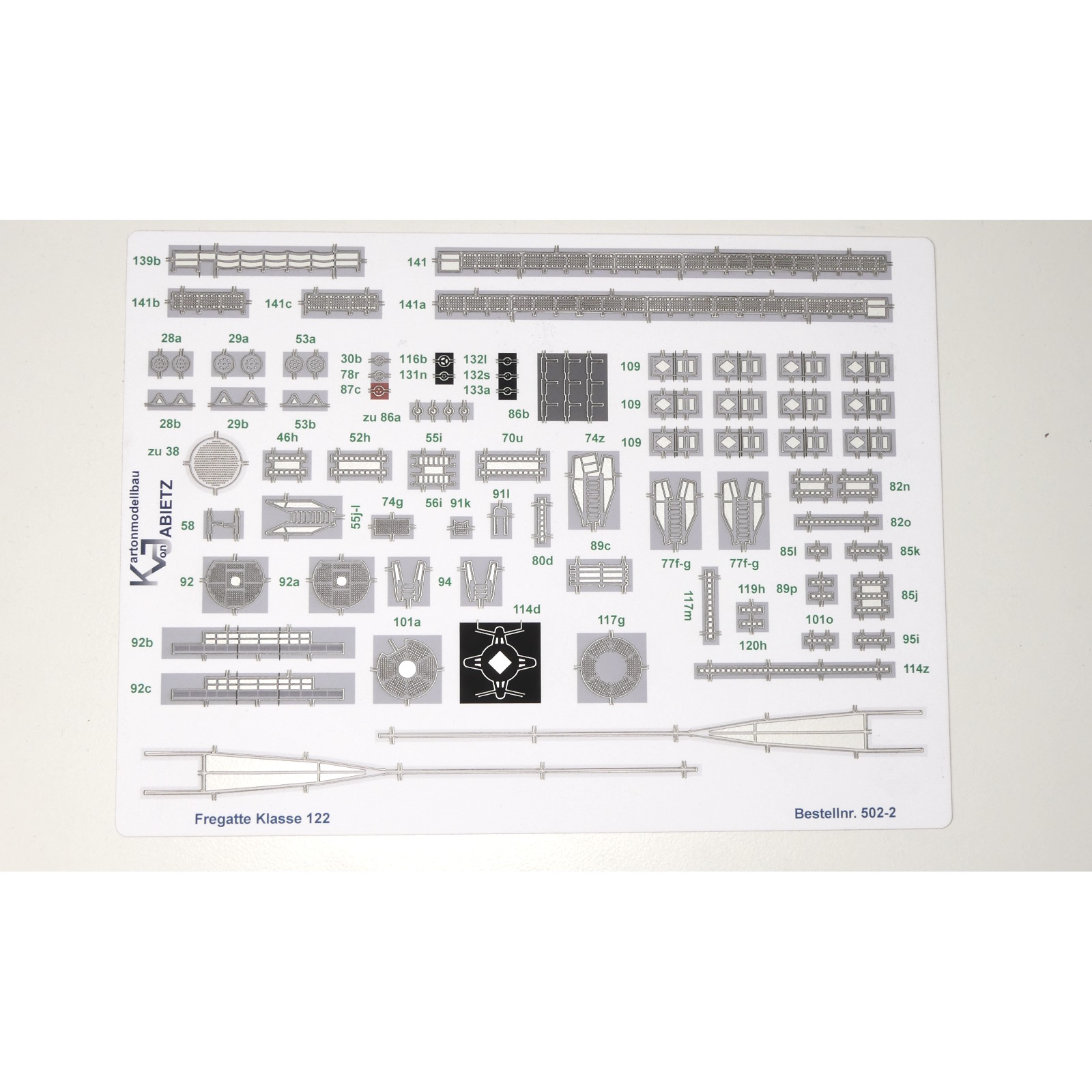 Diese feine Lasercut-Zusatzplatine enthält 99 filigrane Bauteile. Mit diesen Teilen können die jeweiligen Kartonteile des Modellbaubogens des Fregatte ersetzt werden.